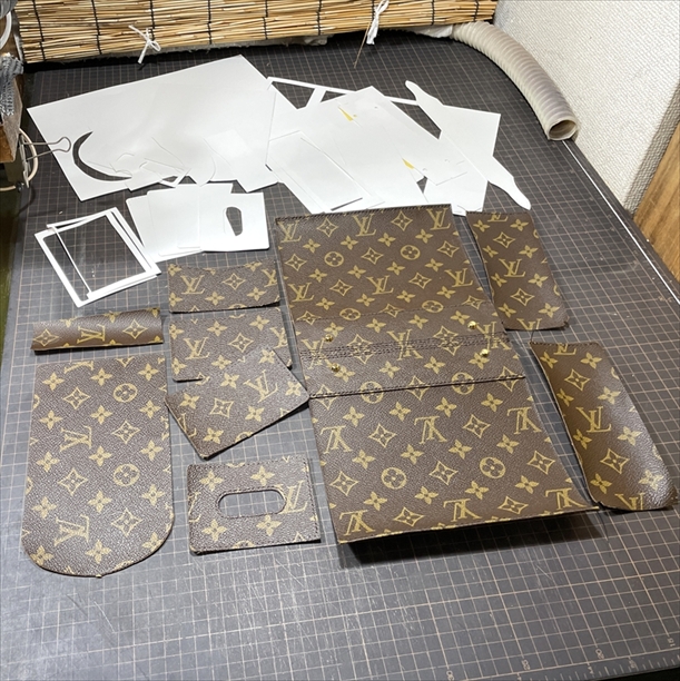 ご愛用されていた2つのバッグから普段使いが出来るようなショルダーバッグやキーケースなどにリメイクのオーダーを頂きました😊大変長らくお待たせ致しましたがようやく製作の方に入らせて頂きました🙇限られた生地の中で、出来る限り模様が合うように丁寧にパーツ取りをしながら進めさせて頂いています✨